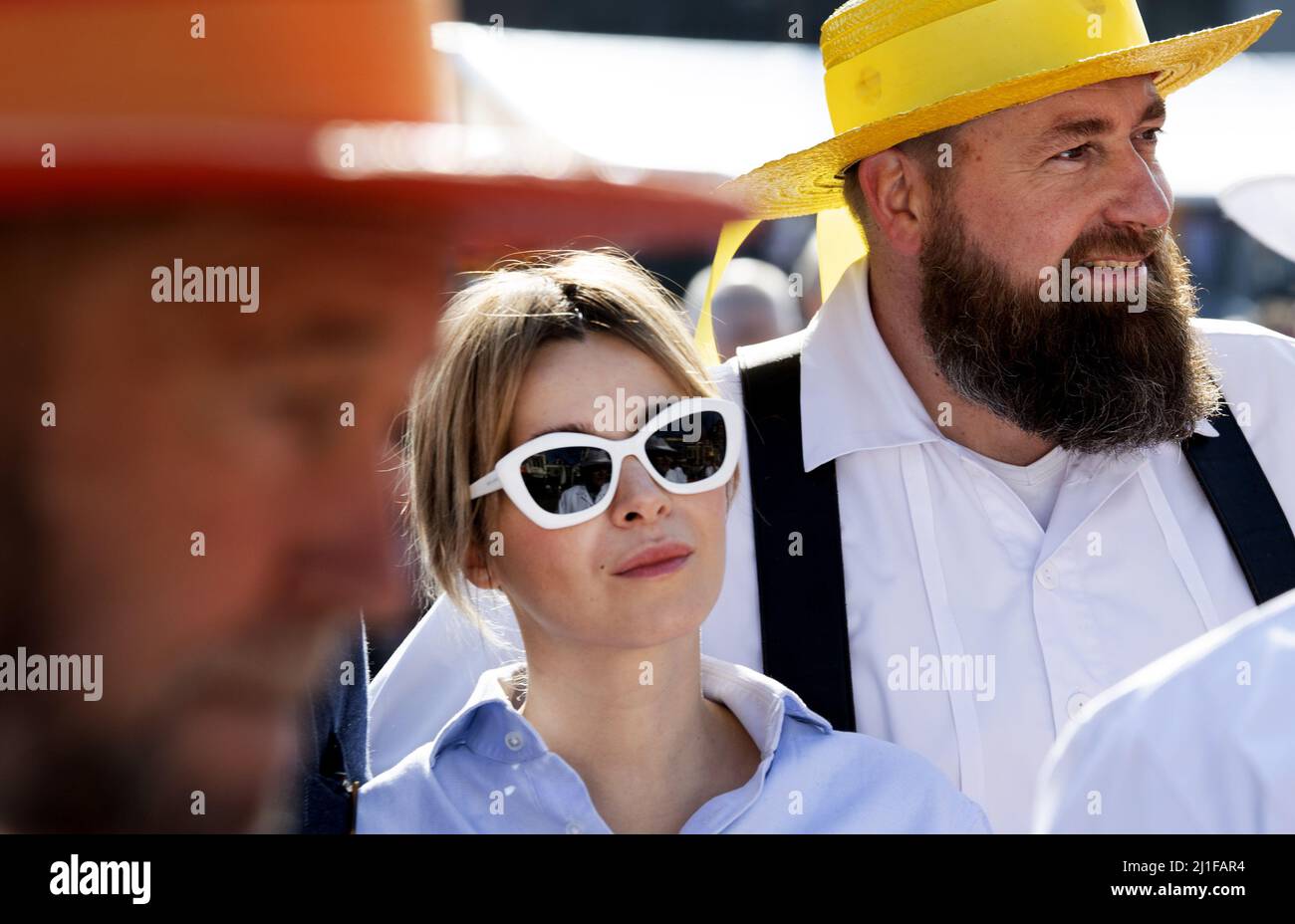 Alkmaar Oud Profvoetballer Evgeniy Levchenko En Actrice Victoria Koblenko Luiden De Kaasbel Tijdens De Opening Van De Eerste Kaasmarkt Van Het Seizoen Op Het Waagplein Met Hun Aanwezigheid Vroegen Ze Aandacht Voor